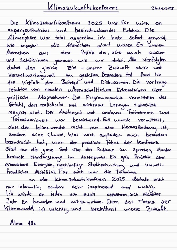 “Die Teilnahme an der Klimakonferenz war für mich eine beeindruckende und bereichernde Erfahrung. Besonders toll fand ich, dass ich mich mit vielen Expert*innen sowie verschiedenen Organisationen austauschen konnte und dabei ganz neue Einblicke in aktuelle Klimathemen bekommen habe. Die Gespräche und die Workshops haben mein Interesse geweckt. Insgesamt war es für mich ein inspirierender Tag und er hat mir viele neue Perspektiven eröffnet.” (Victoria 10e)