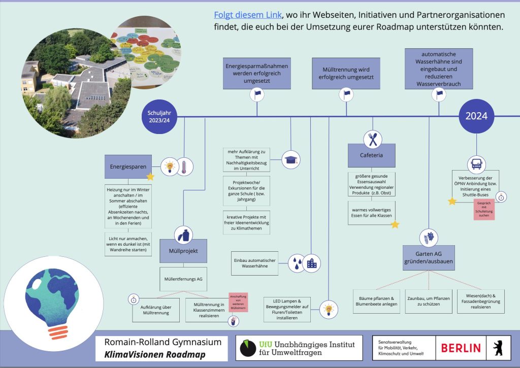 Anschließend hatten die Schüler:innen die Aufgabe, in kleinen Gruppen nachhaltige Maßnahmen, Ideen, Initiativen, AGs, … für die Schule zu konzipieren und diese dann auch vorzustellen. In der beigefügten Roadmap wurden die Maßnahmen und Ideen von den Schüler:innen priorisiert und auf einem Zeitstrahl angeordnet.