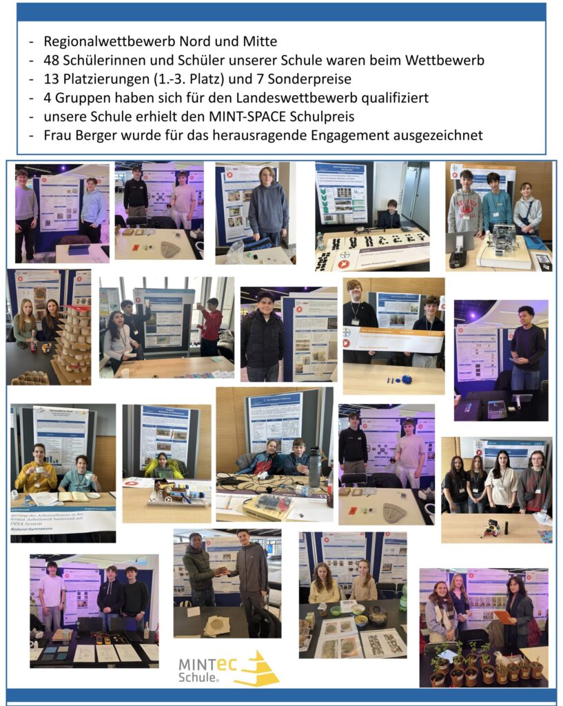 - Unsere Schule erhielt zusätzlich den MINTSPACE Schulpreis für besonderes Engagement in der Förderung junger Naturwissenschaftlerinnen und Naturwissenschaftler.