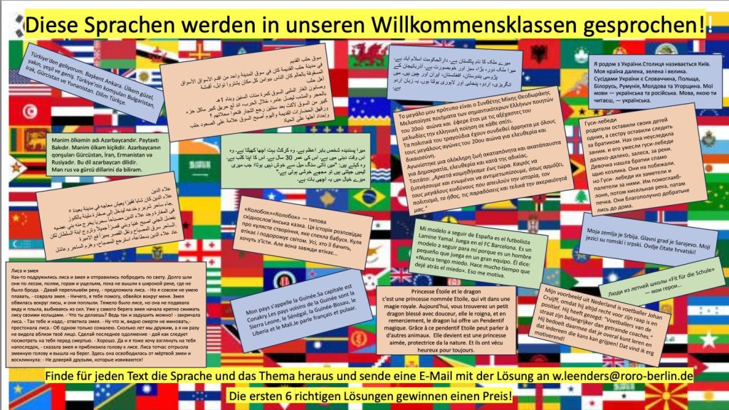 Finde für jeden Text die Sprache und das Thema heraus und sende eine E-Mail mit der Lösung an w.leenders@roro-berlin.de